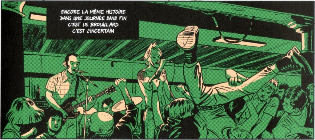 Oiry n’a pas son pareil, grâce notamment à son travail sur les trames de noir, pour retranscrire la fièvre des concerts Rock, avec la furie des pogos et l’énergie de la musique que l’on peut presque entendre à travers les cases.