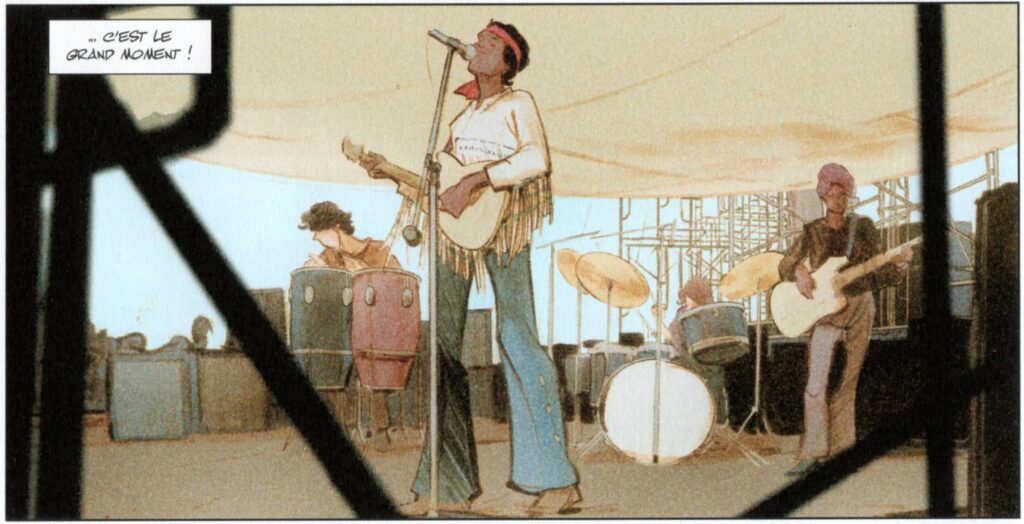 Il en détient le record d’affluence : 500 000 personnes. Un documentaire et un album Live ont immortalisé l’évènement. De nombreux bouquins ont été écrits dont quelques BD. « Woodstock 69 » est la dernière en date. Kid Toussaint a pris le parti scénaristique, plutôt que de pondre un énième biopic, d’utiliser ce monument de l’histoire du Rock comme toile de fond à une intrigue purement fictive, illustrant les trois piliers du mythe Woodstock : Paix, Amour et Musique. Un petit cahier documentaire à la fin de l’album fournit les choses essentielles à connaître sur ces 4 jours exceptionnels qui ont réuni quasiment toute la crème du Rock de l’époque. On n’a jamais revu une telle densité de talents depuis, hormis le Live Aid en 1985.