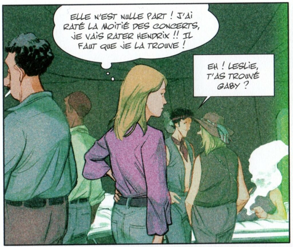 J’aime faire des clins-d’œil à mes amis en les dessinant dans mes BD. Dans la scène du festival rock, j’ai fait apparaitre mon petit ami, c’est lui qui prend de la drogue avec les héroïnes (le vilain !). Comme il a grandi à Angers, c’est lui qui m’a soufflé qu’un des membres de son « groupe » devrait porter un t-shirt des Thugs !